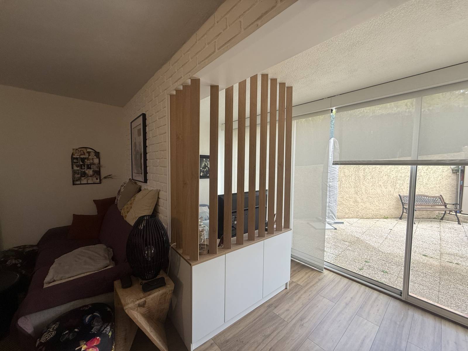 À Marignane, Provence Placards a réalisé un meuble de rangement avec claustras sur mesure permettant de structurer l’espace tout en conservant luminosité et légèreté visuelle dans un studio.